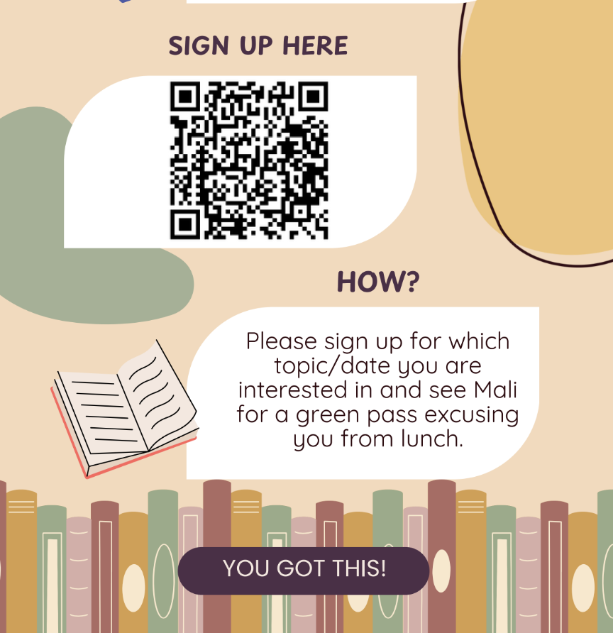 Students can sign up on the QR code for specific topics and dates that best fit their needs. After signing up, be sure to see Mali for a green pass excusing you from lunch.
