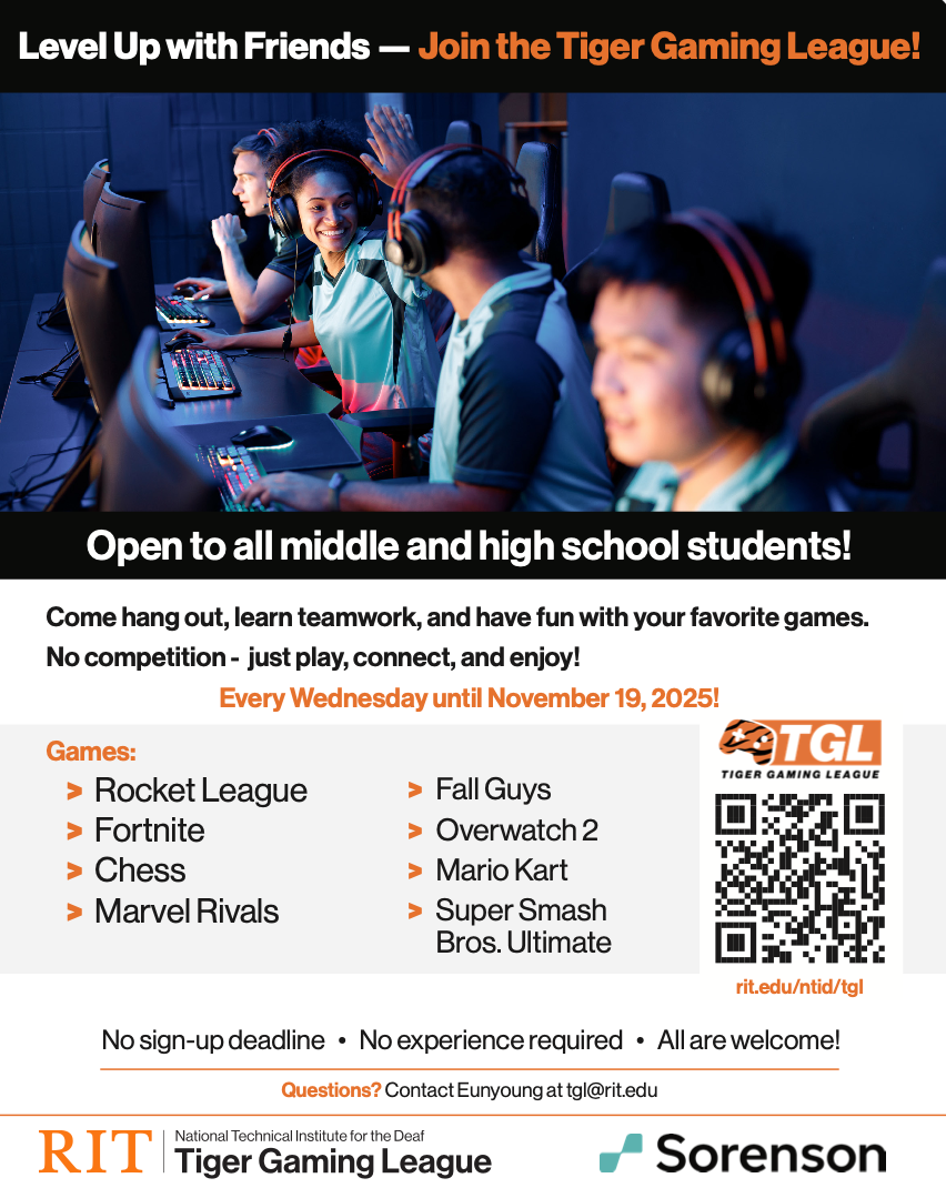 I wanted to share a program opportunity from the National Technical Institute for the Deaf (NTID) Youth Programs at Rochester Institute of Technology (RIT), sponsored by Sorenson. It may be of interest to your school and students.I wanted to share a program opportunity from the National Technical Institute for the Deaf (NTID) Youth Programs at Rochester Institute of Technology (RIT), sponsored by Sorenson. It may be of interest to your school and students.I wanted to share a program opportunity from the National Technical Institute for the Deaf (NTID) Youth Programs at Rochester Institute of Technology (RIT), sponsored by Sorenson. It may be of interest to your school and students.I wanted to share a program opportunity from the National Technical Institute for the Deaf (NTID) Youth Programs at Rochester Institute of Technology (RIT), sponsored by Sorenson. It may be of interest to your school and students.I wanted to share a program opportunity from the National Technical Institute for the Deaf (NTID) Youth Programs at Rochester Institute of Technology (RIT), sponsored by Sorenson. It may be of interest to your school and students.I wanted to share a program opportunity from the National Technical Institute for the Deaf (NTID) Youth Programs at Rochester Institute of Technology (RIT), sponsored by Sorenson. It may be of interest to your school and students.The program is designed to foster community, encourage teamwork, and promote inclusion through gaming. Weekly sessions will feature popular titles such as Rocket League, Fortnite, Chess, Marvel Rivals, Fall Guys, Overwatch 2, Mario Kart, and Super Smash Bros. Ultimate.Program Details:Fall Session 2025Who: Deaf middle and high school studentsWhen: Every Wednesday until November 19, 2025Where: OnlineCost: FreeSpring Session 2026Who: Deaf high school students onlyWhen: January 21 – March 11, 2026Where: OnlineCost: FreeNational CompetitionWhen: April 30 – May 3, 2026Where: NTID, Rochester, NYCost: Details available on the websiteThere is no sign-up deadline or prior experience required to participate.For more information, please visit https://www.rit.edu/ntid/tgl . If your school is interested or has questions, feel free to contact Eunyoung Doucet at [email protected].Thank you for considering this opportunity for your students.Jason WagnerNational Sales Director314.565.2726The program is designed to foster community, encourage teamwork, and promote inclusion through gaming. Weekly sessions will feature popular titles such as Rocket League, Fortnite, Chess, Marvel Rivals, Fall Guys, Overwatch 2, Mario Kart, and Super Smash Bros. Ultimate.Program Details:Fall Session 2025Who: Deaf middle and high school studentsWhen: Every Wednesday until November 19, 2025Where: OnlineCost: FreeSpring Session 2026Who: Deaf high school students onlyWhen: January 21 – March 11, 2026Where: OnlineCost: FreeNational CompetitionWhen: April 30 – May 3, 2026Where: NTID, Rochester, NYCost: Details available on the websiteThere is no sign-up deadline or prior experience required to participate.For more information, please visit https://www.rit.edu/ntid/tgl . If your school is interested or has questions, feel free to contact Eunyoung Doucet at [email protected].Thank you for considering this opportunity for your students.The program is designed to foster community, encourage teamwork, and promote inclusion through gaming. Weekly sessions will feature popular titles such as Rocket League, Fortnite, Chess, Marvel Rivals, Fall Guys, Overwatch 2, Mario Kart, and Super Smash Bros. Ultimate.Program Details:Fall Session 2025Who: Deaf middle and high school studentsWhen: Every Wednesday until November 19, 2025Where: OnlineCost: FreeSpring Session 2026Who: Deaf high school students onlyWhen: January 21 – March 11, 2026Where: OnlineCost: FreeNational CompetitionWhen: April 30 – May 3, 2026Where: NTID, Rochester, NYCost: Details available on the websiteThere is no sign-up deadline or prior experience required to participate.For more information, please visit https://www.rit.edu/ntid/tgl . If your school is interested or has questions, feel free to contact Eunyoung Doucet at [email protected].Thank you for considering this opportunity for your students.The program is designed to foster community, encourage teamwork, and promote inclusion through gaming. Weekly sessions will feature popular titles such as Rocket League, Fortnite, Chess, Marvel Rivals, Fall Guys, Overwatch 2, Mario Kart, and Super Smash Bros. Ultimate.Program Details:Fall Session 2025Who: Deaf middle and high school studentsWhen: Every Wednesday until November 19, 2025Where: OnlineCost: FreeSpring Session 2026Who: Deaf high school students onlyWhen: January 21 – March 11, 2026Where: OnlineCost: FreeNational CompetitionWhen: April 30 – May 3, 2026Where: NTID, Rochester, NYCost: Details available on the websiteThere is no sign-up deadline or prior experience required to participate.For more information, please visit https://www.rit.edu/ntid/tgl . If your school is interested or has questions, feel free to contact Eunyoung Doucet at [email protected].Thank you for considering this opportunity for your students.The program is designed to foster community, encourage teamwork, and promote inclusion through gaming. Weekly sessions will feature popular titles such as Rocket League, Fortnite, Chess, Marvel Rivals, Fall Guys, Overwatch 2, Mario Kart, and Super Smash Bros. Ultimate.Program Details:Fall Session 2025Who: Deaf middle and high school studentsWhen: Every Wednesday until November 19, 2025Where: OnlineCost: FreeSpring Session 2026Who: Deaf high school students onlyWhen: January 21 – March 11, 2026Where: OnlineCost: FreeNational CompetitionWhen: April 30 – May 3, 2026Where: NTID, Rochester, NYCost: Details available on the websiteThere is no sign-up deadline or prior experience required to participate.For more information, please visit https://www.rit.edu/ntid/tgl . If your school is interested 