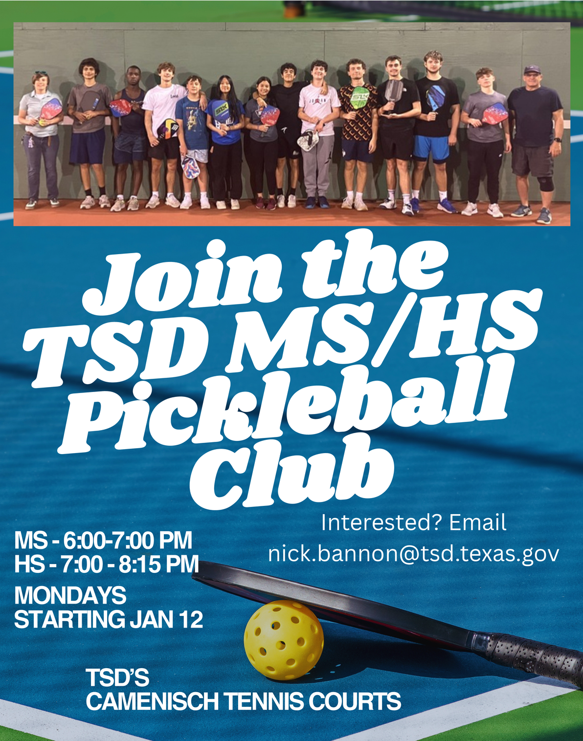 TSD Student Life will continue to have a Pickleball Club and we are expanding to include Middle School students (in addition to High School Students). The Pickleball Club will be held Monday's beginning January 12, 2026 and shall continue throughout the spring semester.