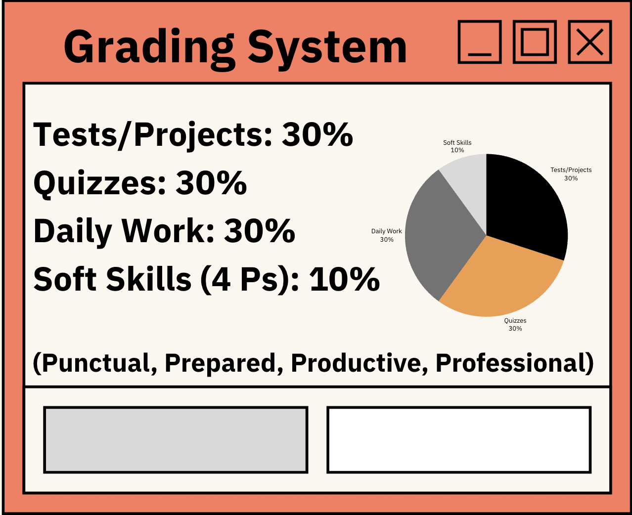 Grading system: Tests/Projects: 30%, Quizzes: 30%, Daily Work: 30%, Soft Skills (4 Ps): 10% (Punctual, Prepared, Productive, Professional)