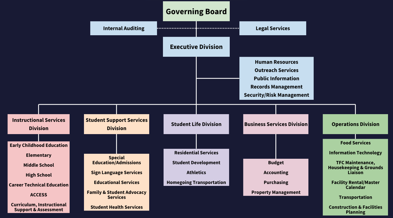 TSD is organized into five divisions: Instruction, Student Life, and Business Services, with the Executive Division overseeing all of these.